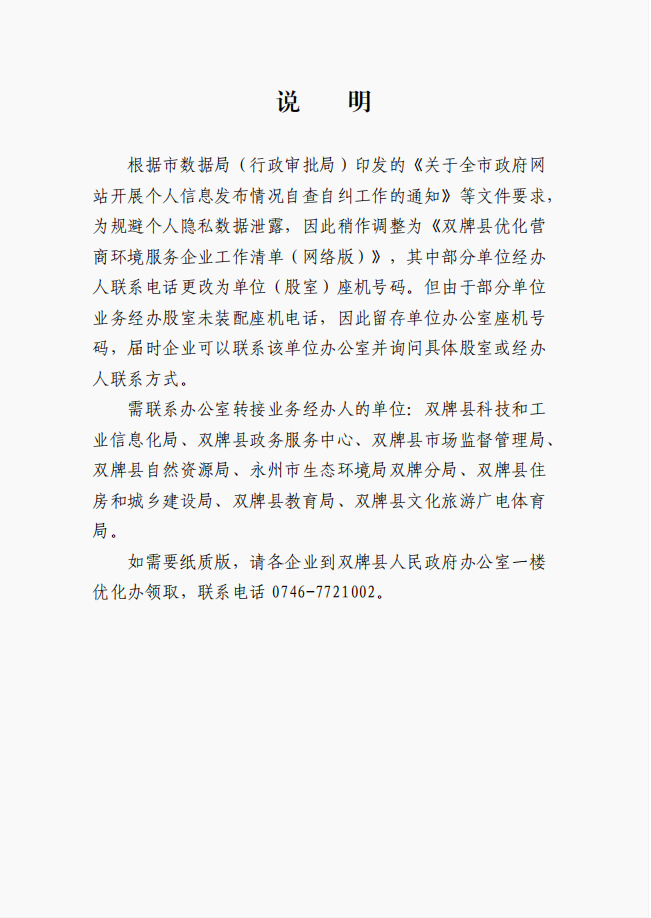 为方便企业办理业务,营造更加便捷的营商环境,双牌县优化经济发展环境办公室联合21个部门编制了《双牌县优化营商环境服务企业工作清单》,涵盖各单位涉企审批的工作责任、服务清单(涉企审批事项相关的申请材料、办结时限、办理流程、办理方式、办理地点、经办人、联系电话)等内容。