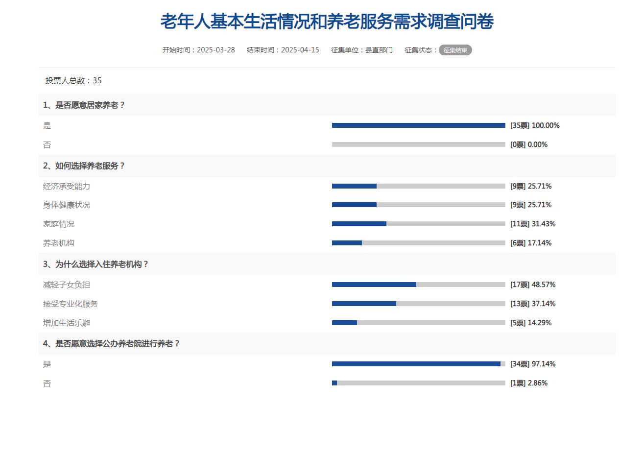 随着我国老龄化程度的不断加剧,如何提供更好的养老服务成为社会各界关注的焦点之一。为了全面了解双牌县老年人养老服务需求情况,特开展本次问卷调查,调查时间为2025年3月28日至2025年4月15日。通过在双牌县人民政府网站发布问卷调查的方式,开展了双牌县老年人基本生活情况和养老服务需求情况调查,下一步,我们将结合调查结果做好养老服务工作,更好地服务群众。现将调查结果公布如下: