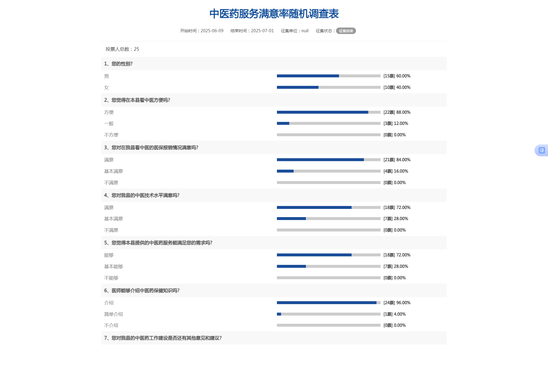 该问卷调查从2025年6月9日开始至2025年7月1日结束,问卷内容主要涉及公众对我县中医药服务满意率进行了调查。