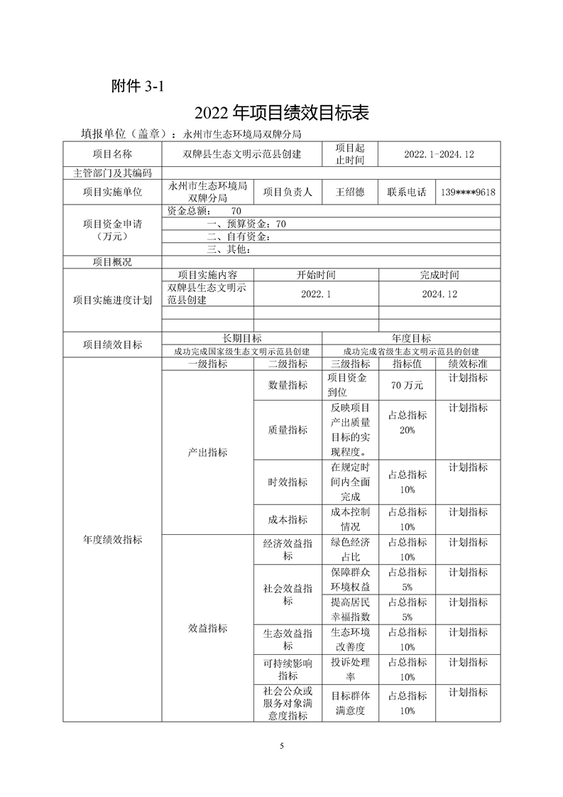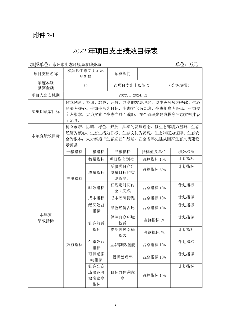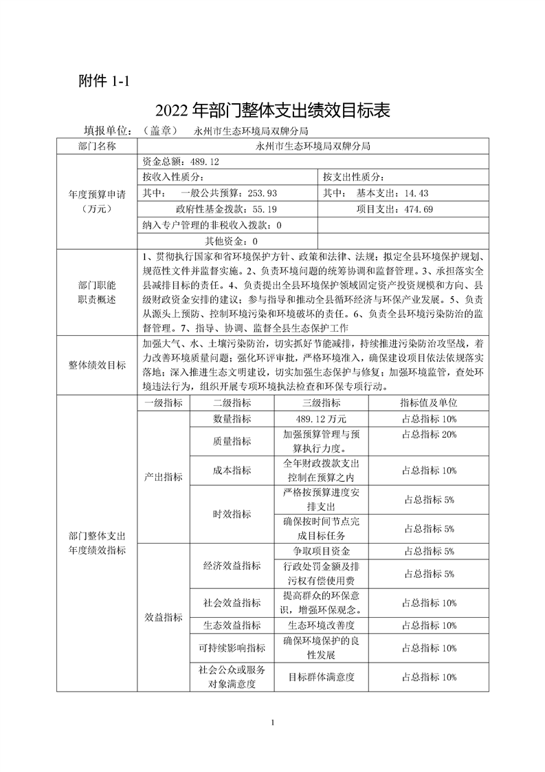 2022年度永州市生态环境局双牌分局部门预算绩效目标表