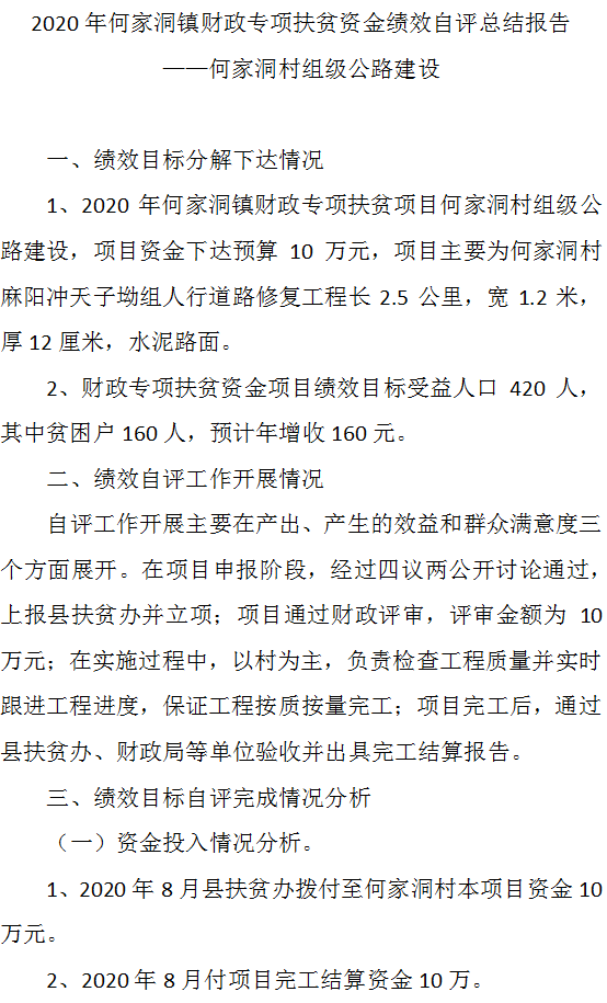 2020年何家洞镇财政专项扶贫资金绩效自评总结报告 ——何家洞村组级公路建设