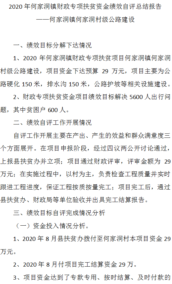 2020年何家洞镇财政专项扶贫资金绩效自评总结报告 ——何家洞镇何家洞村级公路建设