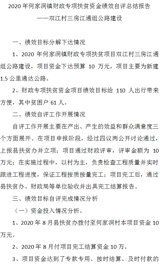 2020年何家洞镇财政专项扶贫资金绩效自评总结报告 ——双江村三房江通组公路建设
