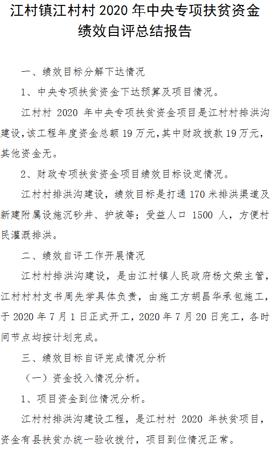 江村镇江村村2020年中央专项扶贫资金(排水沟建设)绩效自评总结报告