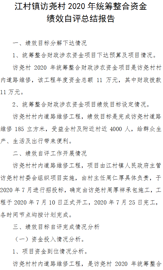 江村镇访尧村2020年统筹整合资金绩效自评总结报告