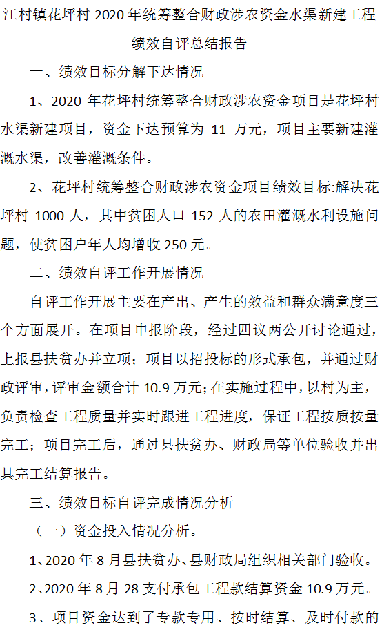 江村镇花坪村2020年统筹整合财政涉农资金水渠新建工程绩效自评总结报告