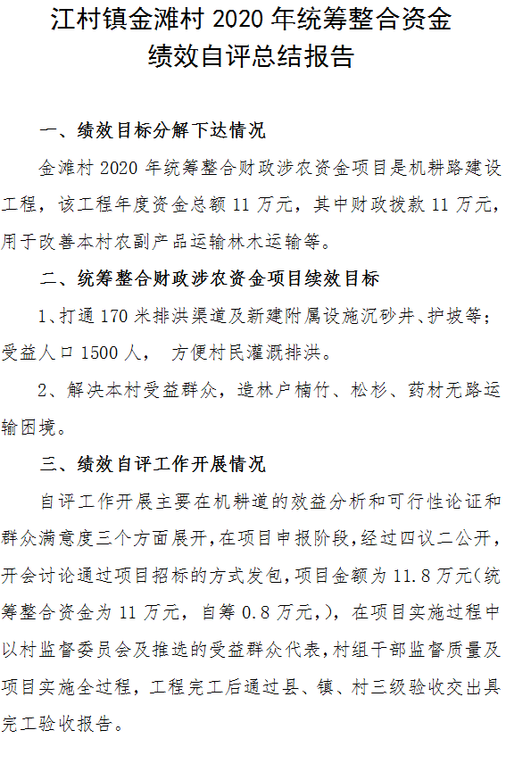 江村镇金滩村2020年统筹整合资金绩效自评总结报告
