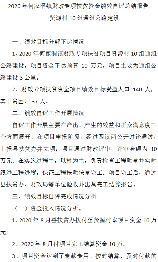 2020年何家洞镇财政专项扶贫资金绩效自评总结报告 ——贤源村10组通组公路建设