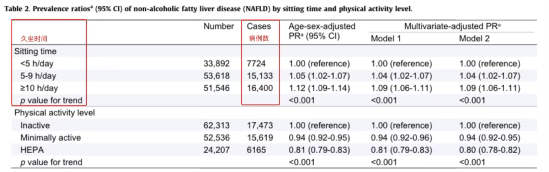 非酒精性脂肪肝病在不同久坐时间和身体活动水平下的患病率比 来源:丁香医生