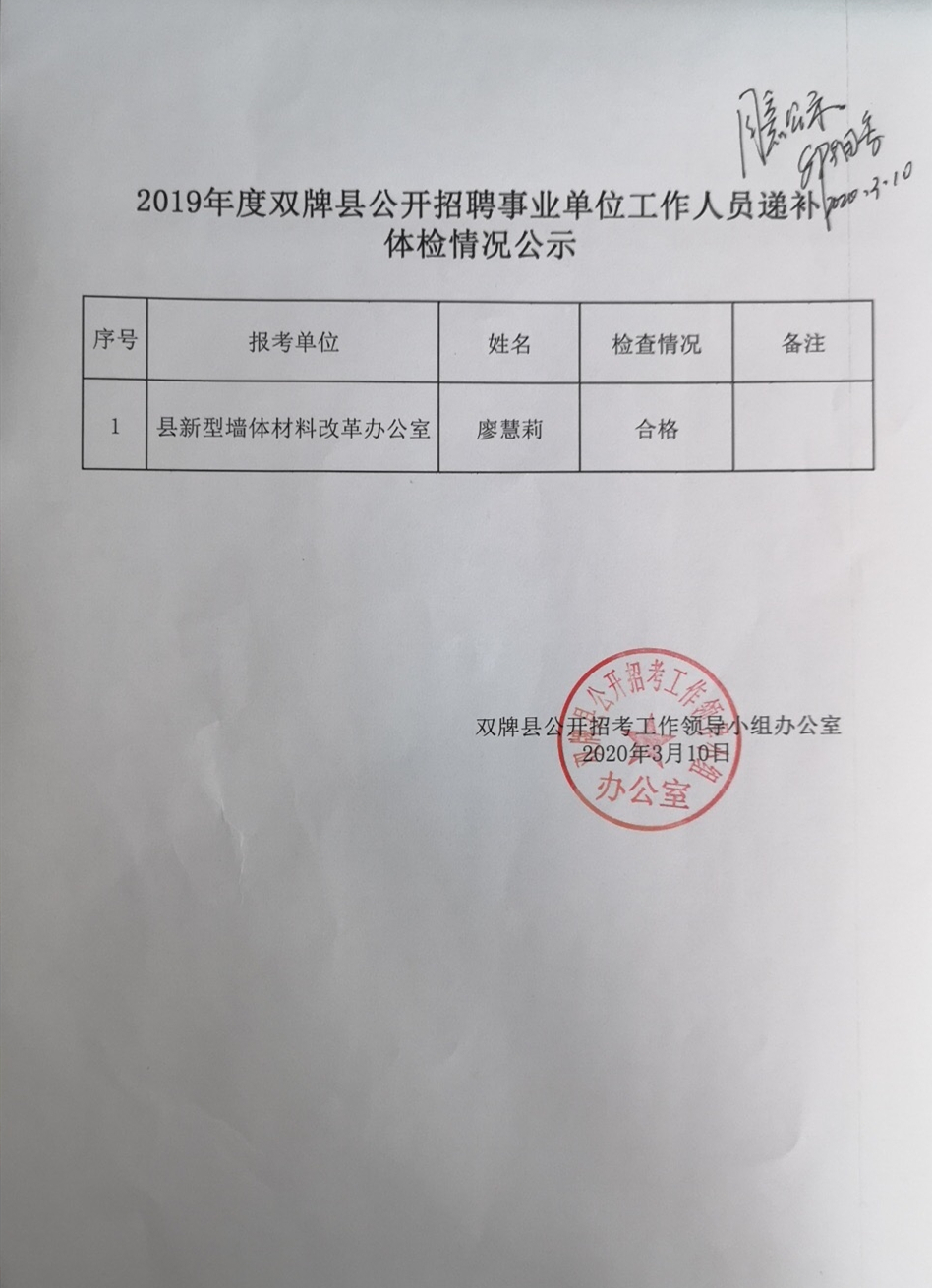 2019年度双牌县公开招聘事业单位工作人员递补体检情况公示