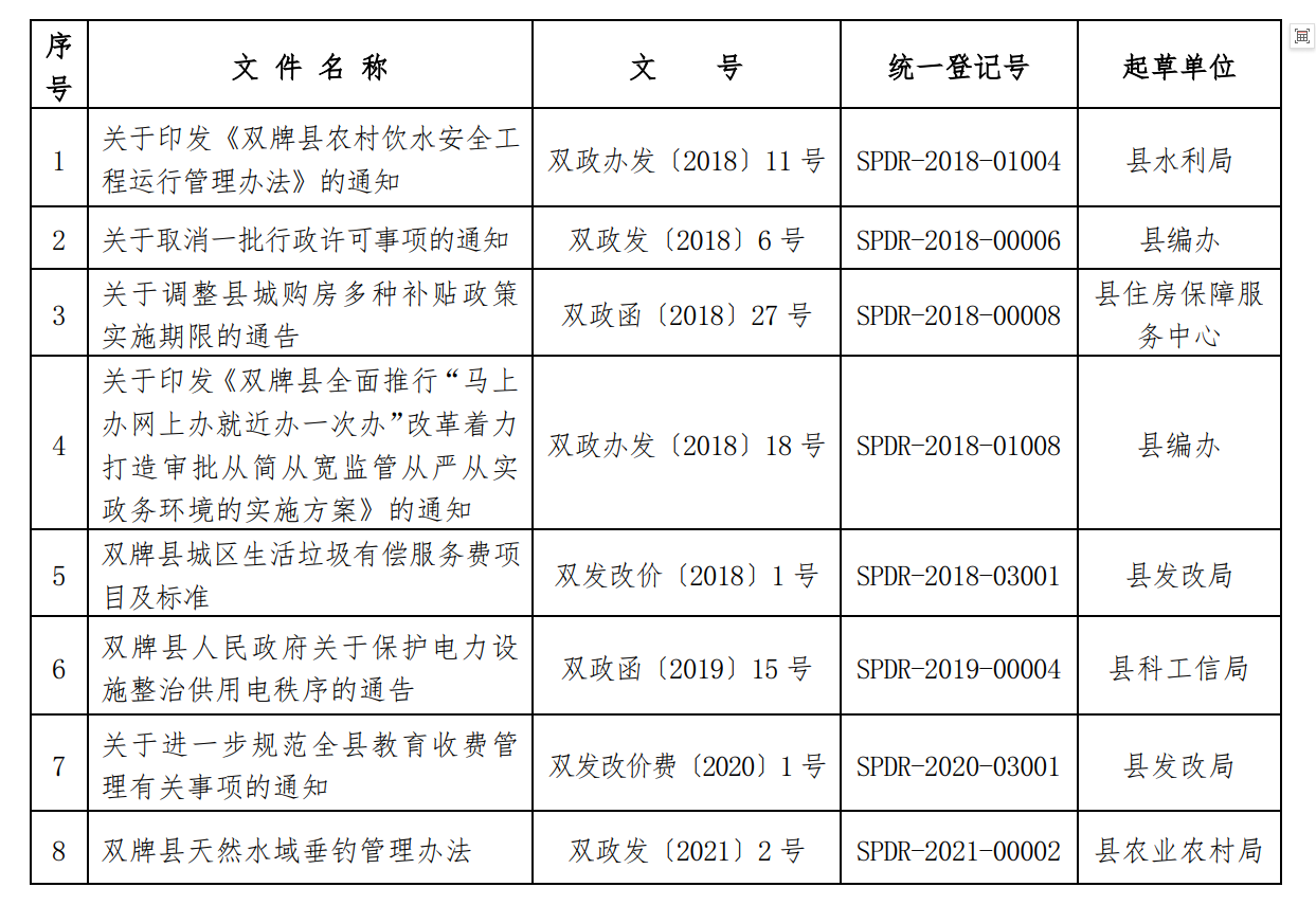一、《关于印发〈双牌县 农村饮水安全工程运行管理 办法〉的通知》(双政办发 〔2018〕11 号)等 8 件规范 性文件,目前虽在有效期内, 但是其主要内容与法律、法规、 规章及上位规范性文件的规 定不一致,或不适应现实需要, 无继续实施的必要,予以废止 (见附件 1)。