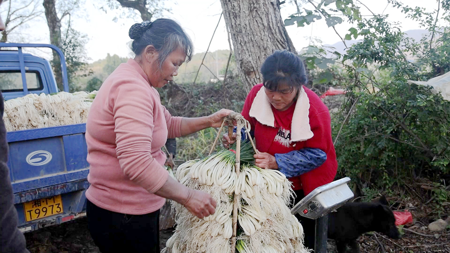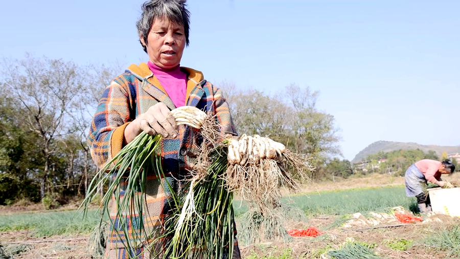 藠头种植不仅鼓起了种植户的腰包,还为周边村民提供了家门口的就业岗位,让不少留守老人和妇女实现务工增收。“我们年纪大了,去外地打工没人要。现在在基地干活,早上八点到下午两三点,一天能挣一百五六十块,很划算。” 基地务工人员蒋娥英说。