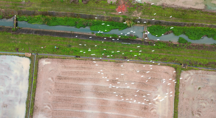据了解,每年三月当地大田翻耕之际,便会吸引成群白鹭前来栖息觅食。肥沃的土壤富含有机质,为白鹭提供了充足的昆虫、泥鳅等天然饵料。它们或在田间觅食休憩,或梳理羽翼,或结伴翱翔,尽情徜徉在这片生态沃土之上。