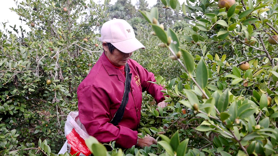走进油茶林,连片油茶树顺着山势铺展,层层枝叶间挂满了紫红色的油茶果,在秋日暖阳下油润鲜亮。趁着晴好天气,种植户盘心合一大早就跟老伴来到自家油茶林采摘油茶。他告诉记者,2016年,县移民开发局结合朝阳村特点,通过项目扶持、以奖代补等方式,引进优质油茶品种,全村开始发展油茶种植产业,如今种植面积已超千亩。今年他家20亩油茶林进入盛果期,茶果饱满、色泽鲜亮,预计产量可达4000斤。