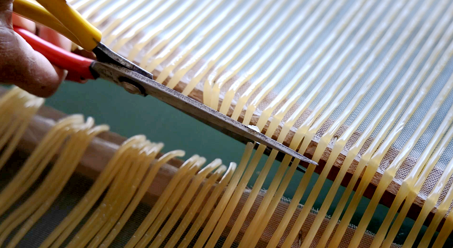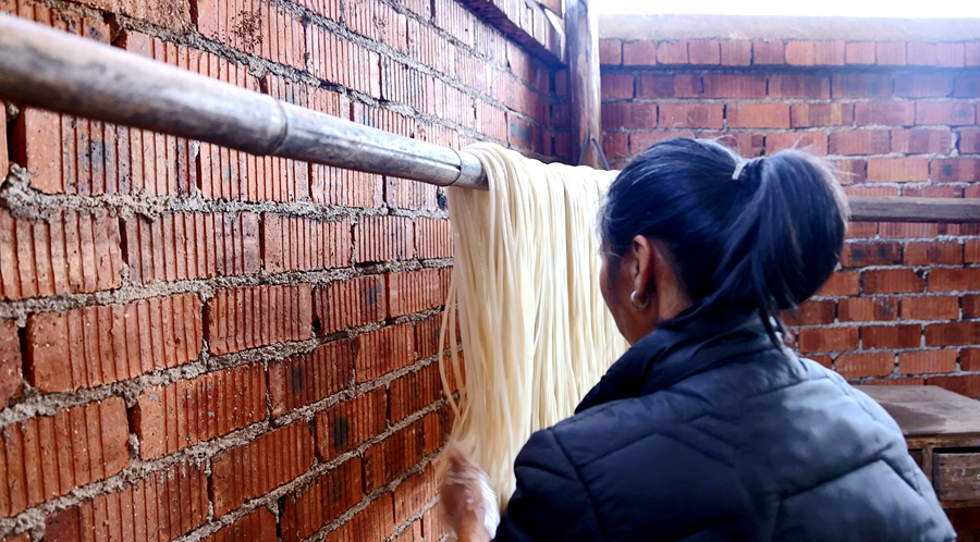为保障红薯粉品质,这里的每一道工序都坚持手工操作,从红薯的挑选到淀粉的提取,再到粉条的晾晒,历经8道工序且不添加任何防腐剂和添加剂。