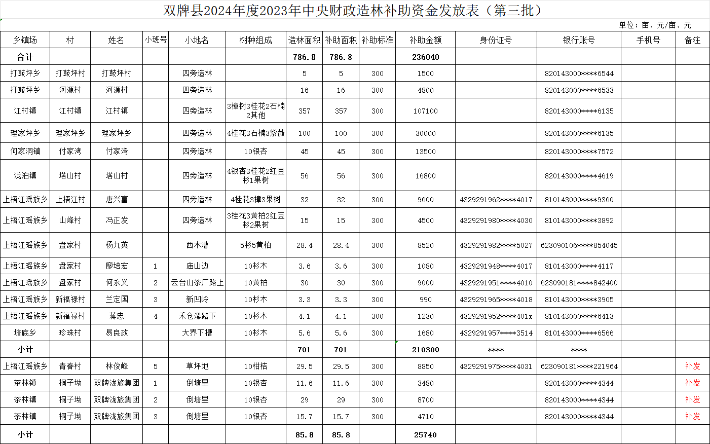 双牌县2024年度2023年中央财政造林补助资金发放表(第三批)