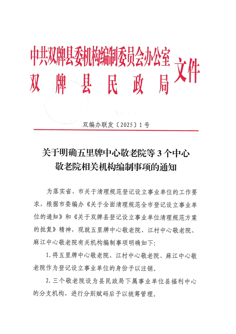 关于明确五里牌中心敬老院等3个中心敬老院相关机构编制事项的通知