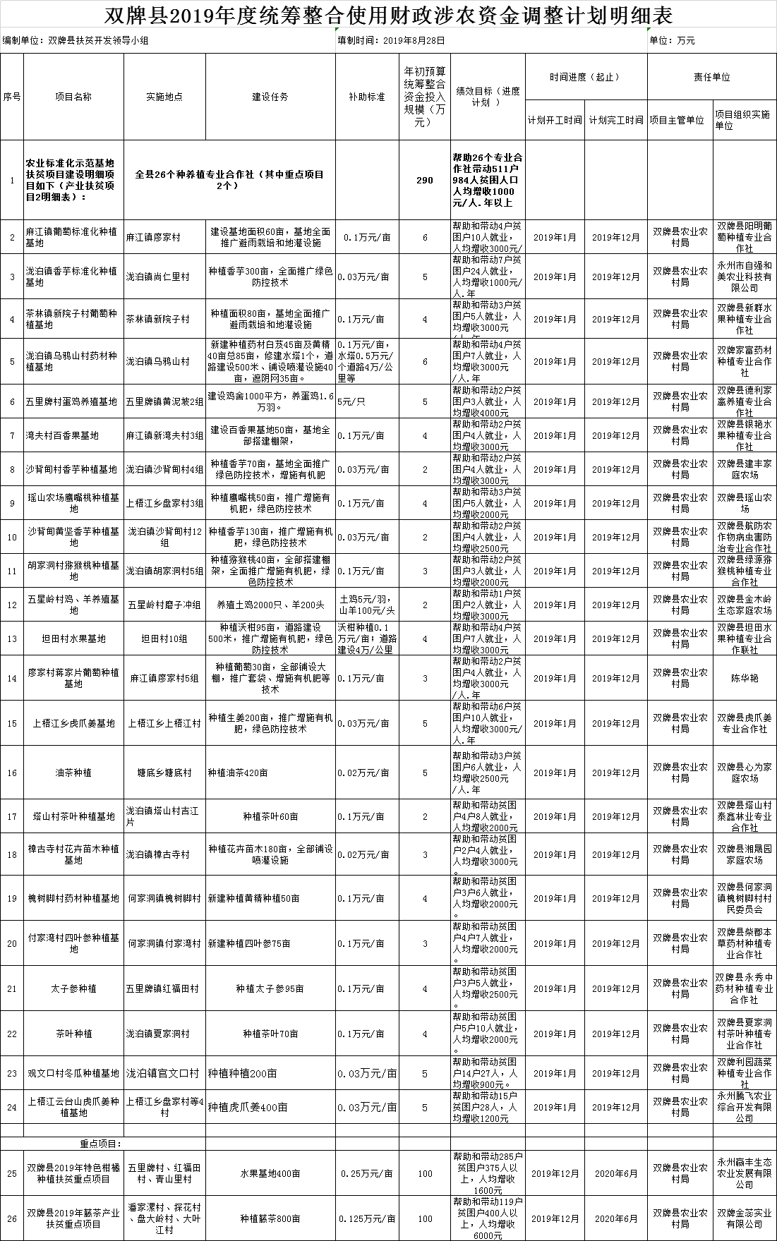 为加快我县农业标准化基地建设,巩固产业扶贫脱贫攻坚成果,助力全县脱贫攻坚和乡镇振兴,现将2019年扶贫整合资金标准化示范基地补助的公示如下: