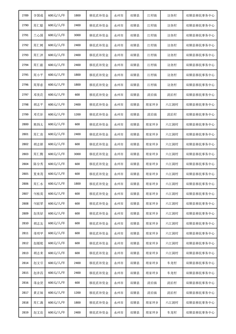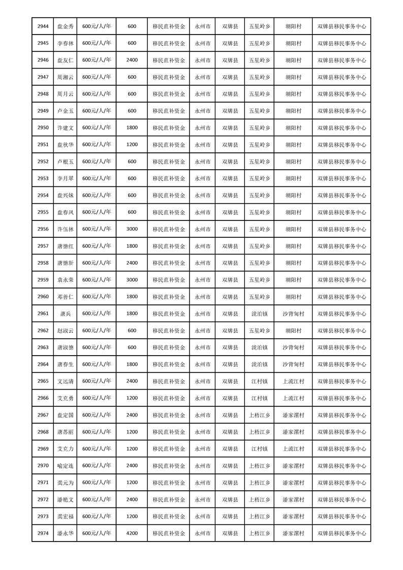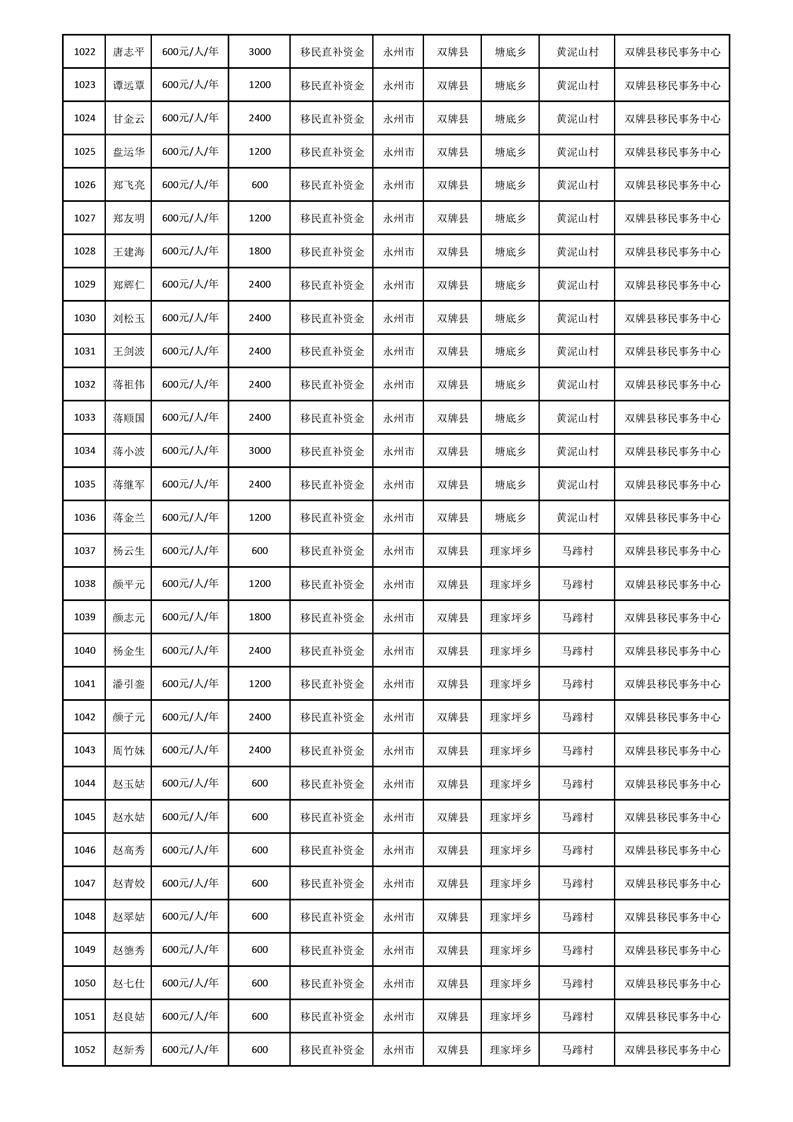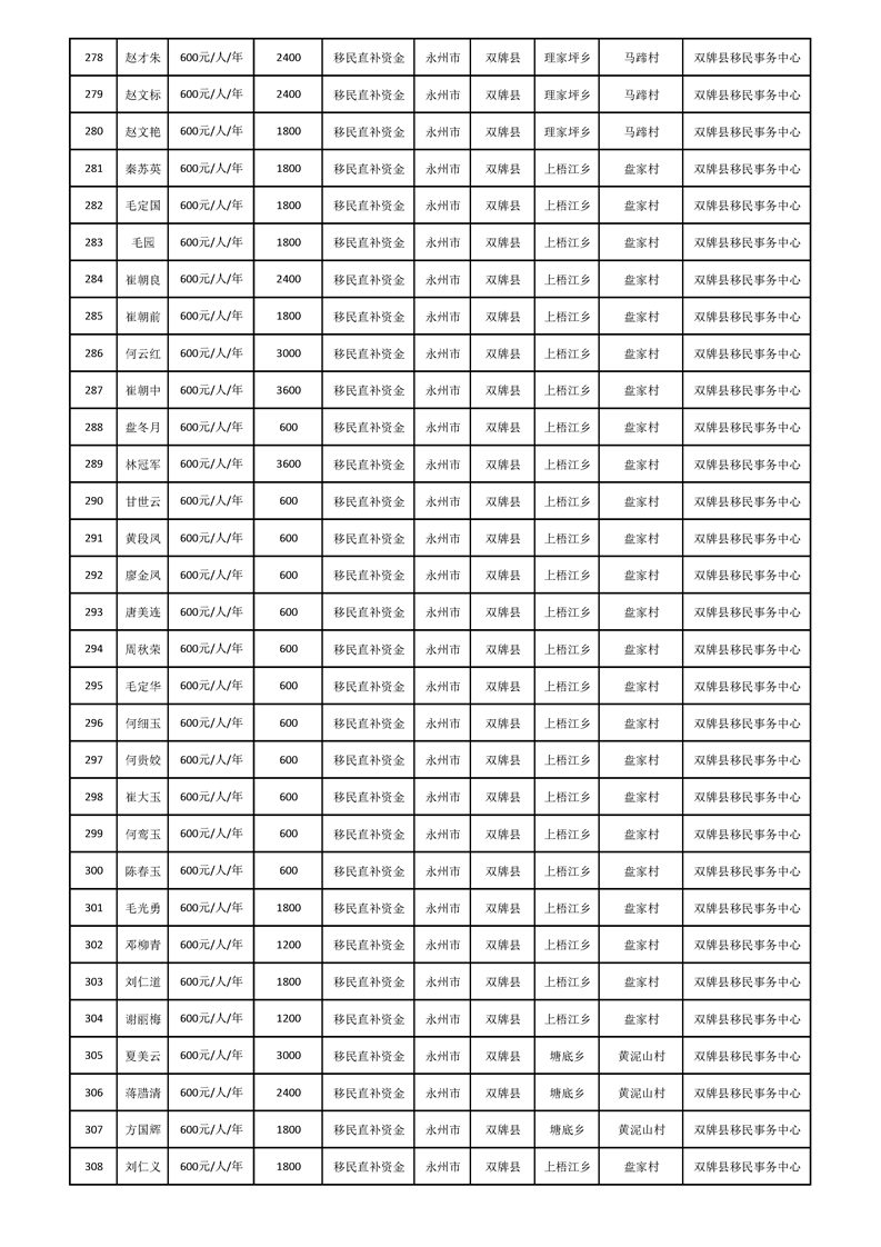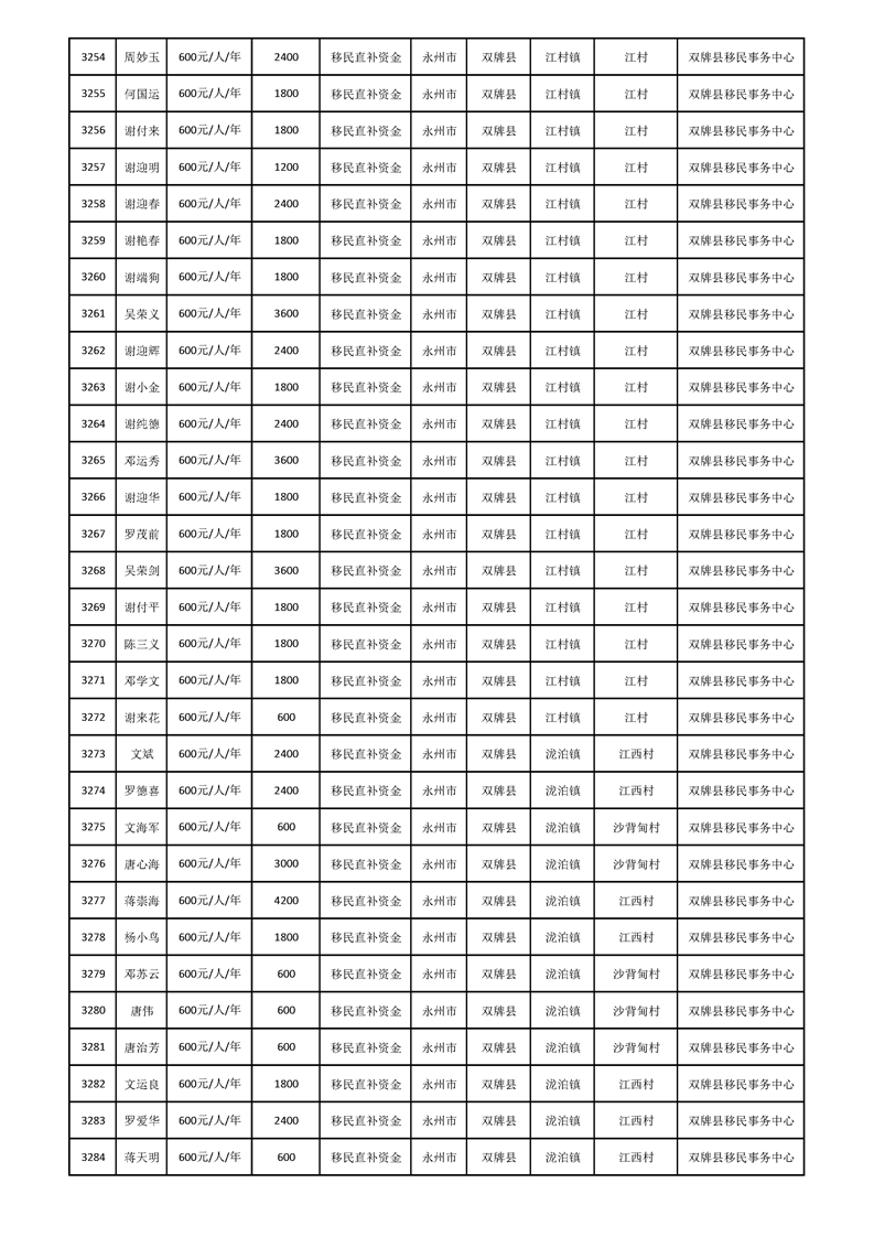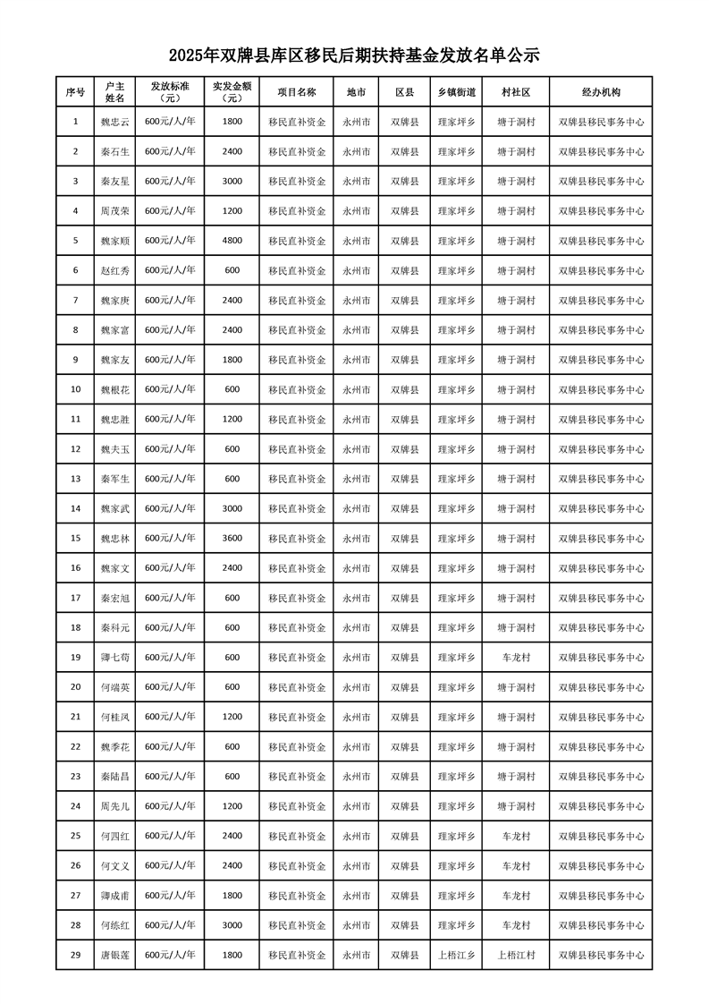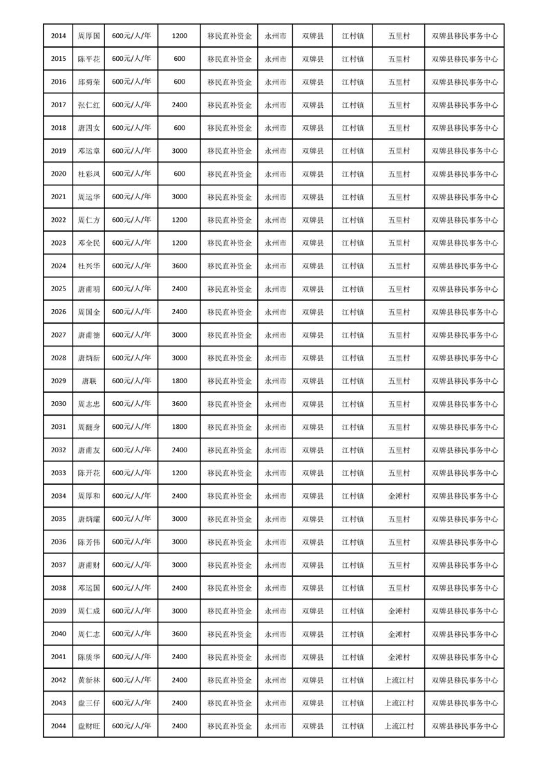 2025年双牌县库区移民后期扶持基金发放名单公示