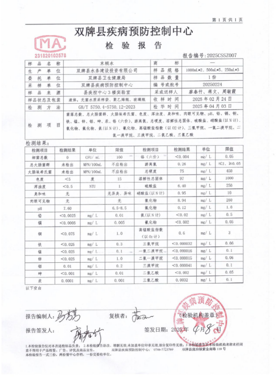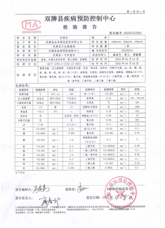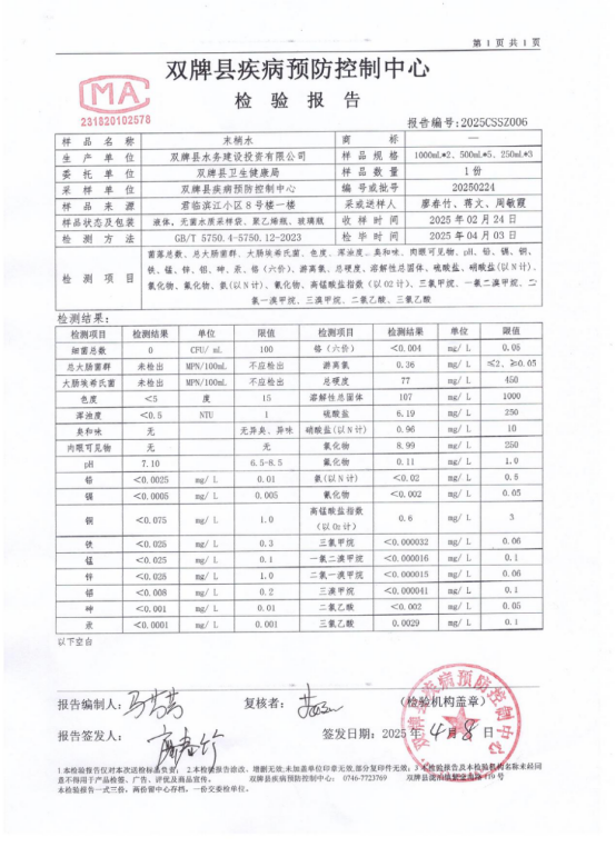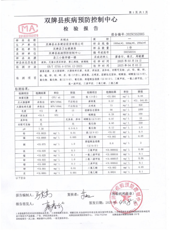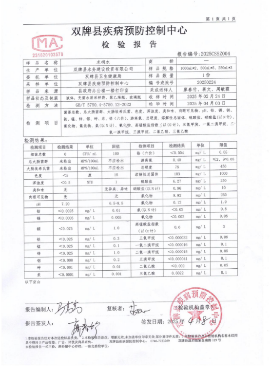 附:2025年第一季度双牌县城区管网末梢水水质检测结果。