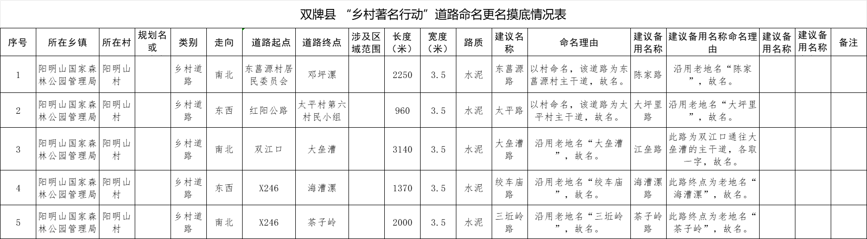 为全面贯彻落实党的二十大精神,提升乡村地名建设水平,助力数字乡村建设和乡村振兴,根据上级有关“乡村著名行动”文件精神,结合阳明山实际情况,围绕乡村地名命名、地名数据采集入库、地名设标、采集上图、数据应用、文化利用等六项任务,开展了双牌县阳明山管理局“乡村著名行动”建设工作。经“乡村著名行动”道路命名程序,初步形成《湖南阳明山国家森林公园管理局拟命名乡村道路一览表》,现将拟命名乡村道路一览表予以公示(详见附表),自通知发布之日起7日内,如有意见、建议请以电话、邮件等形式,于1月7日前反馈至双牌县阳明山管理局。