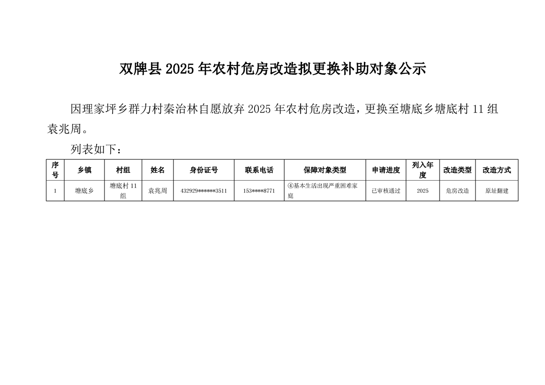 双牌县2025年农村危房改造拟更换补助对象公示