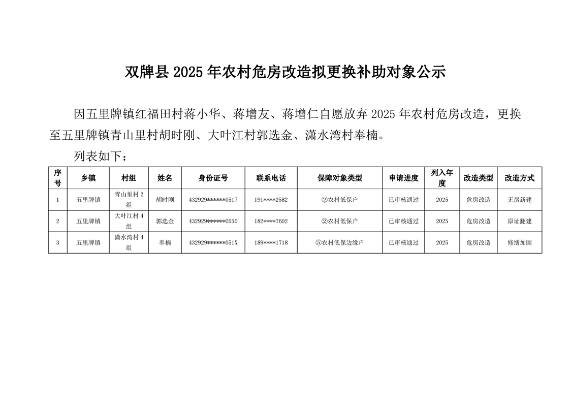双牌县2025年农村危房改造拟更换补助对象公示