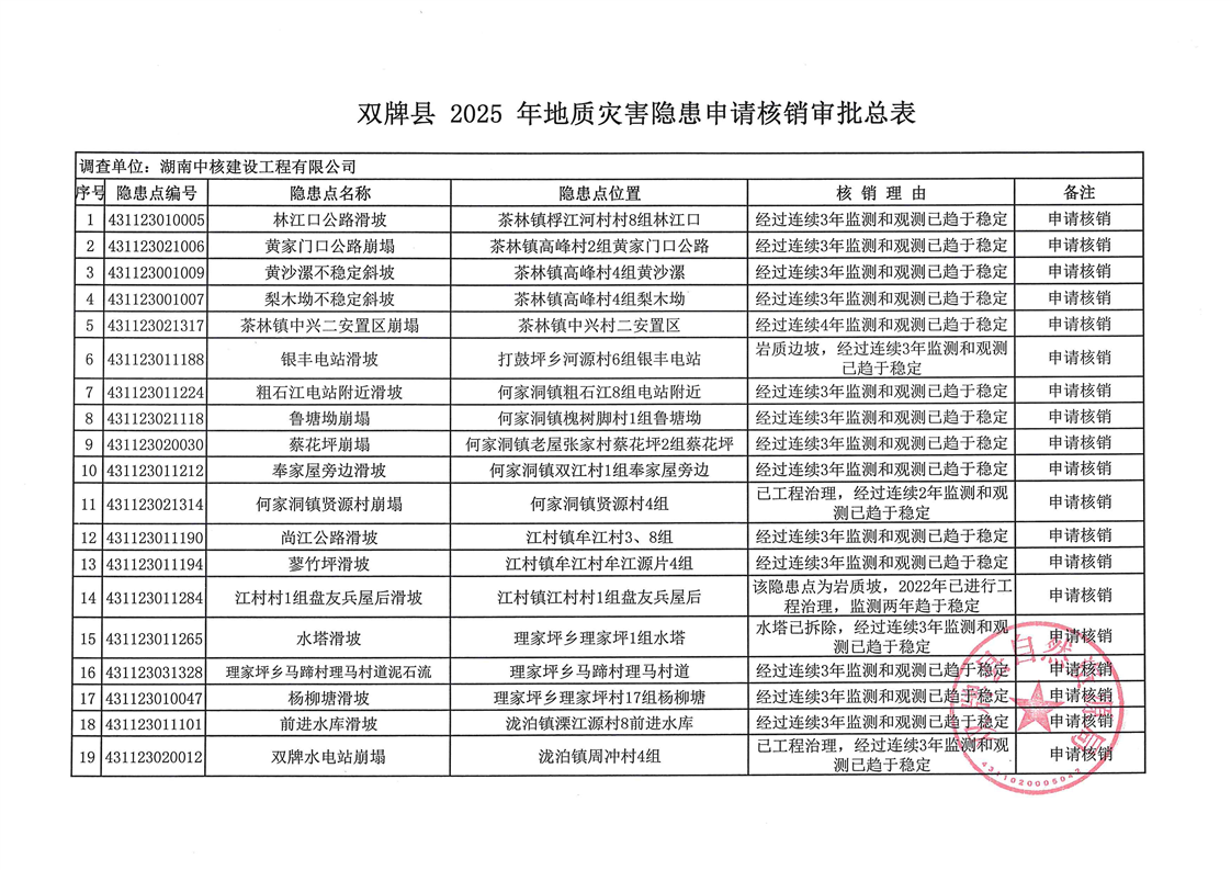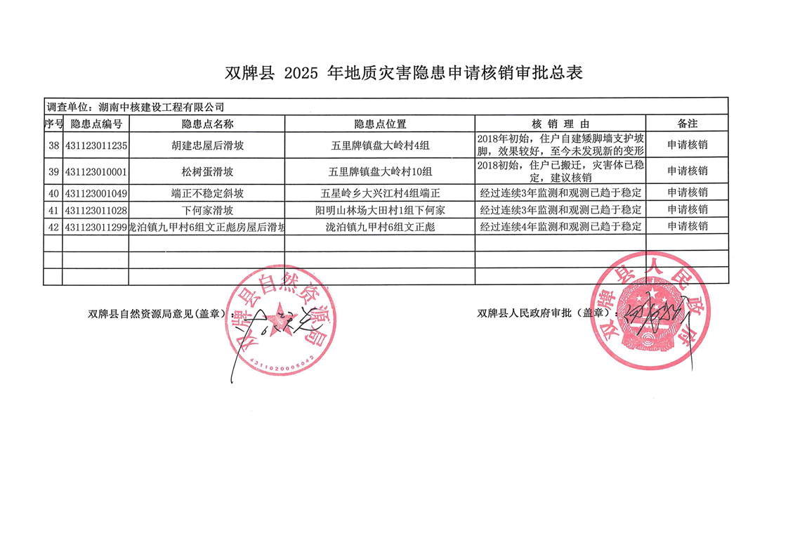 关于双牌县2025年核销42处地质灾害隐患点的公告