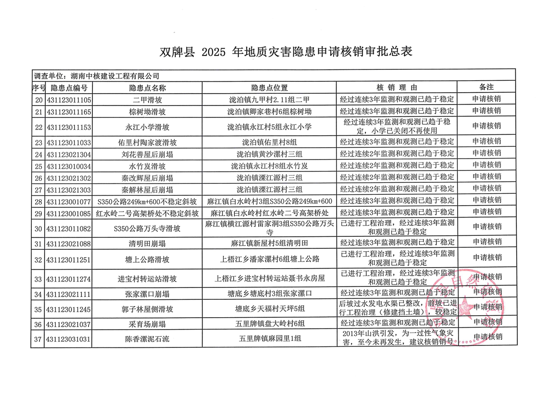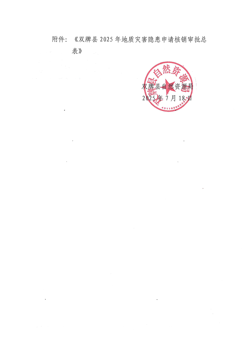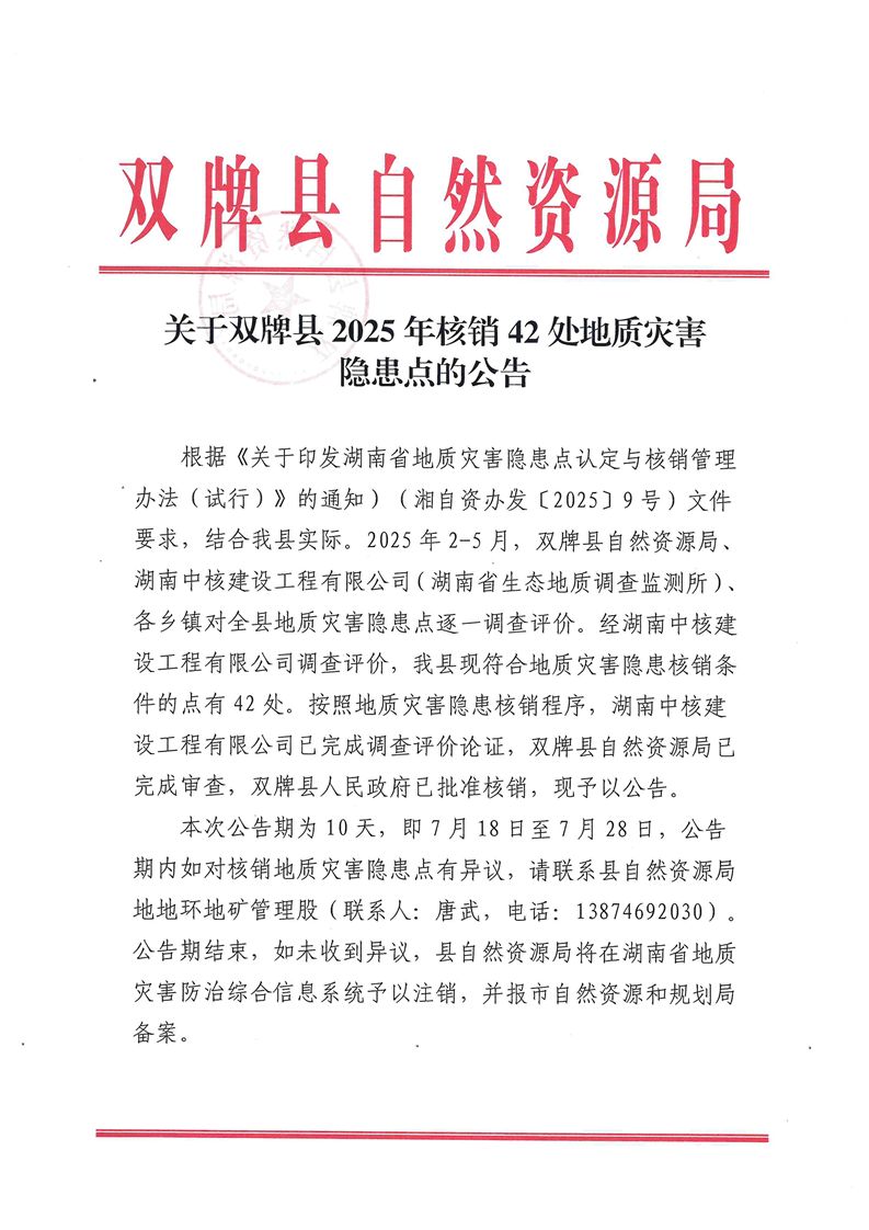 • 名称:关于双牌县2025年核销42处地质灾害隐患点的公告