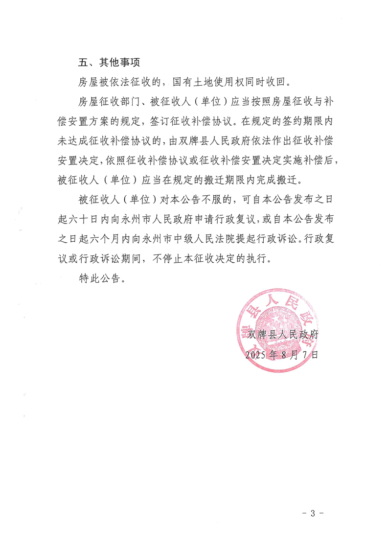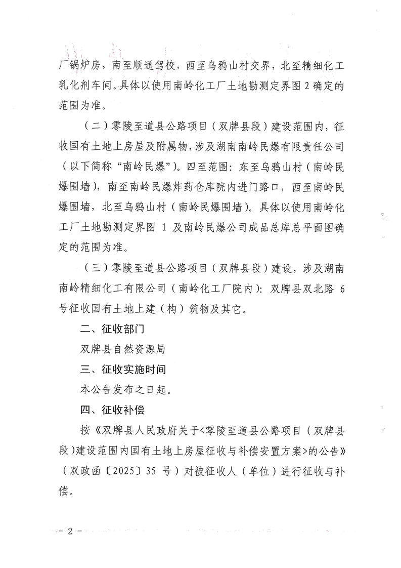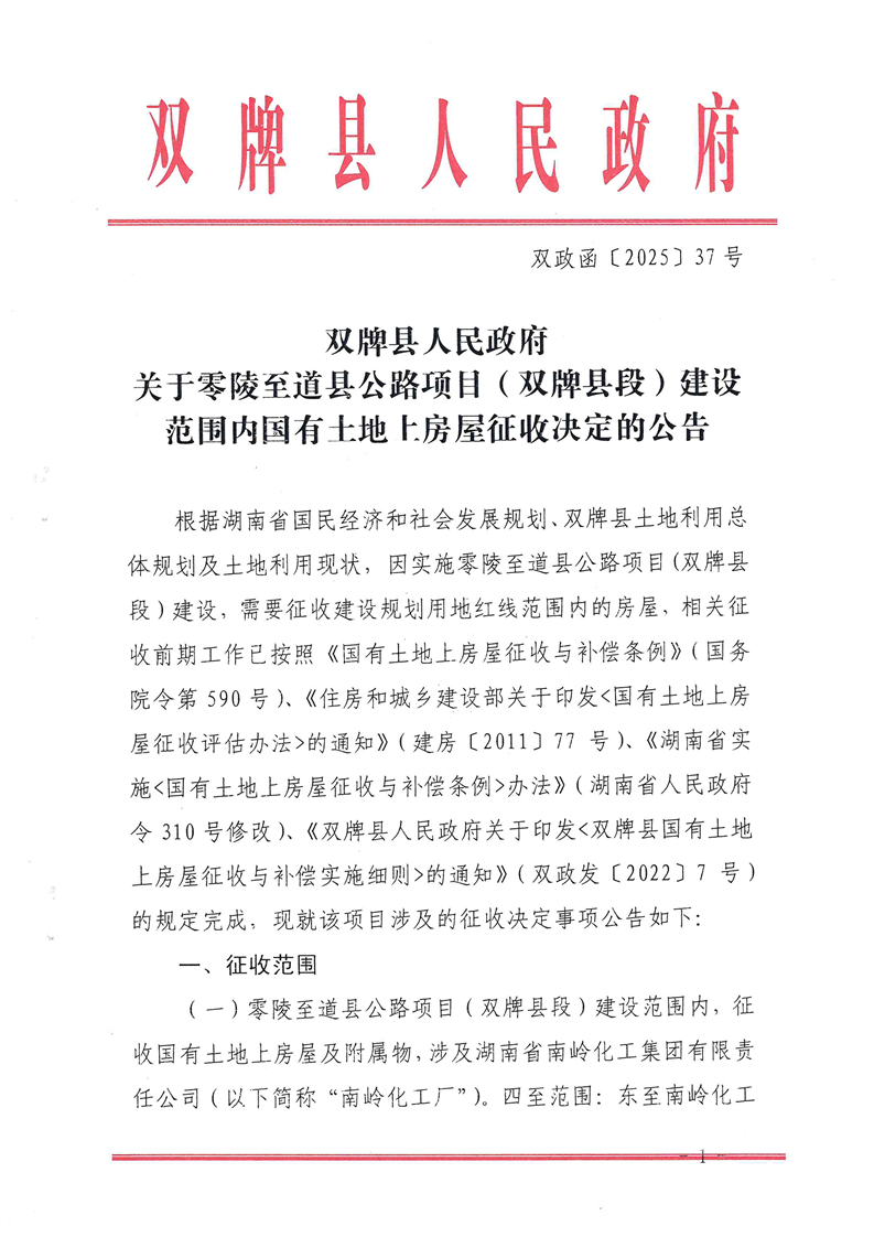 关于零陵至道县公路项目(双牌县段)建设范围内国有土地上房屋征收决定的公告