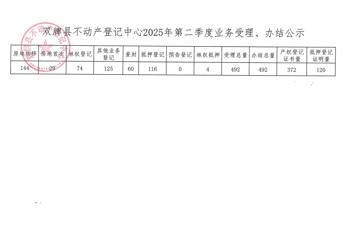 双牌县不动产登记中心2025年第二季度业务受理、办结公示