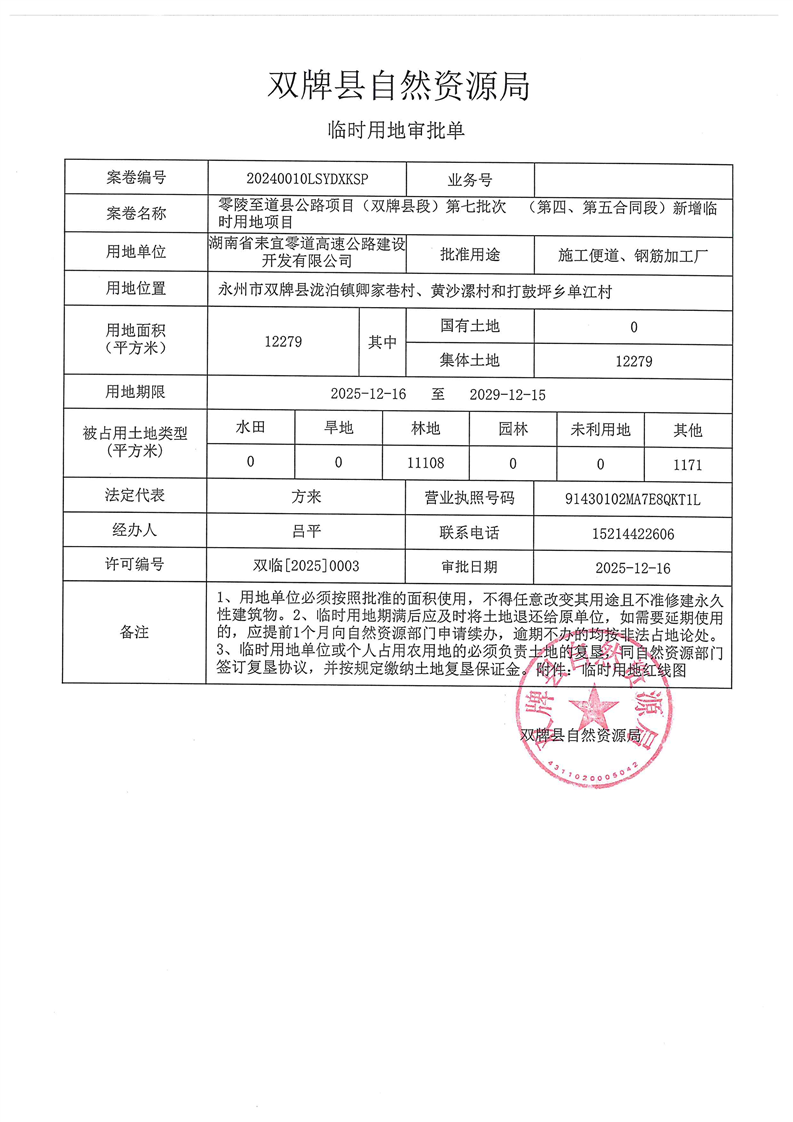 零陵至道县公路项目(双牌县段)第七批次(第四、五合同段)新增临时用地