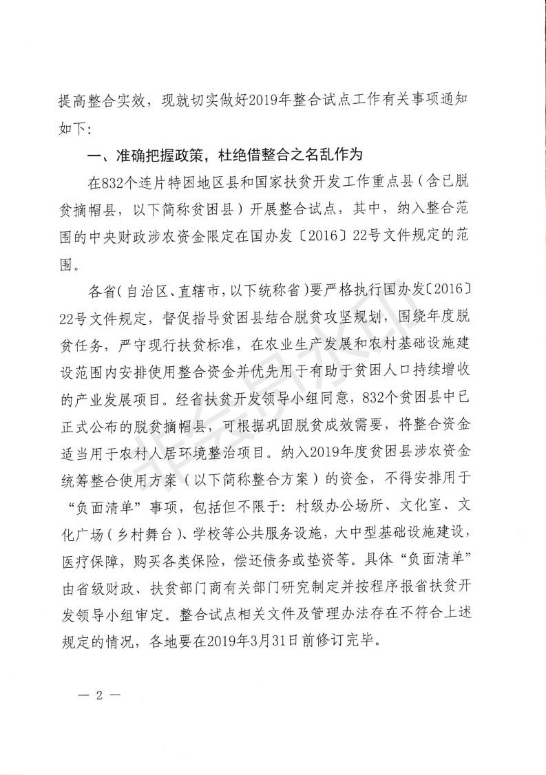 财政部 国务院扶贫办关于做好2019年贫困县涉农资金整合试点工作的通知