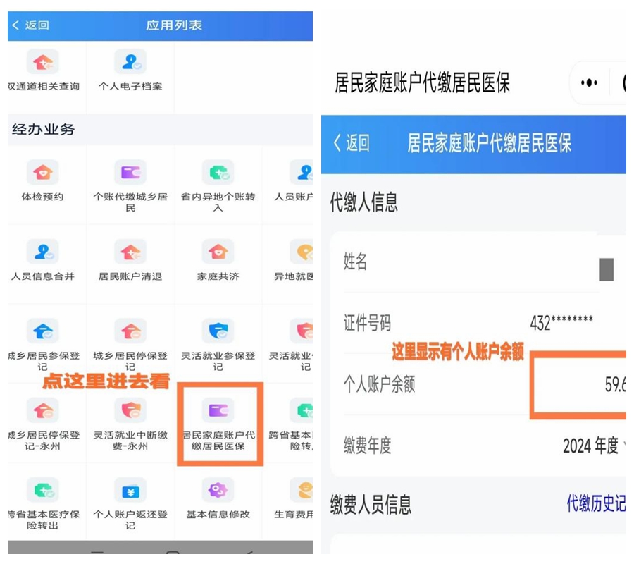 居民家庭账户余额、授权人信息、被授权信息都可以使用家庭成员的身份证号码到乡镇(街道)、村进行查询。家庭账户余额高于380元的,可以直接用于代缴居民医保,由授权人在微信湘医保小程序上,按操作流程给被授权人代缴医保(优先推荐)。