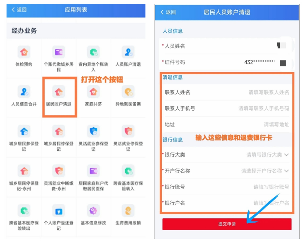 操作路径:微信【湘医保】小程序=》首页【业务办理】,点击更多=》【业务经办】=》居民账户清退