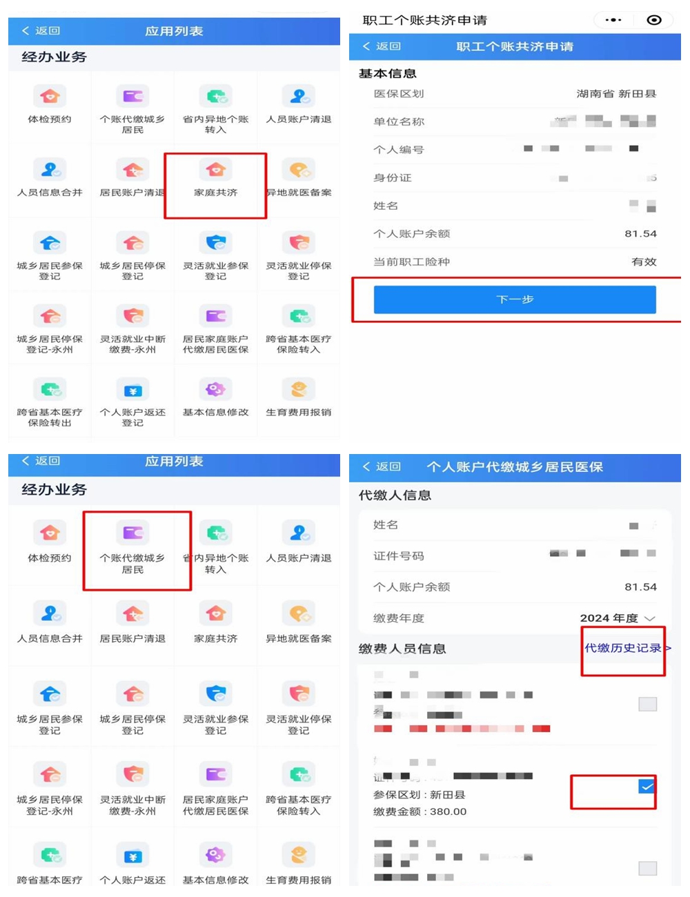 操作路径:“湘医保”APP或微信“湘医保”公众号=》首页【业务办理】,点击更多=》【业务经办】=》家庭共济=》共济申请=》下一步=》输入被绑定人身份证号,选择共济时间,勾选承诺,点击下一步,绑定成功=》个账代缴城乡居民
