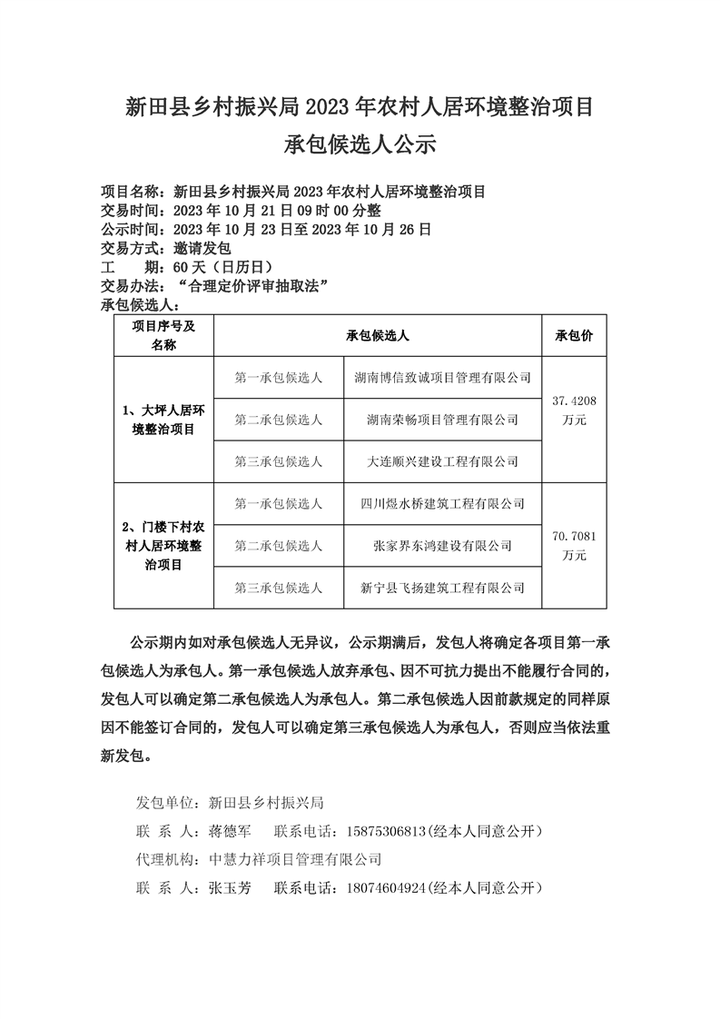 新田县乡村振兴局2023年农村人居环境整治项目承包候选人公示