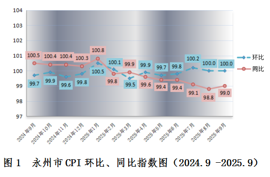 2025年9月份,食品供应总体充足,永州居民消费价格(CPI)同比价格下跌1.0%,环比价格持平。