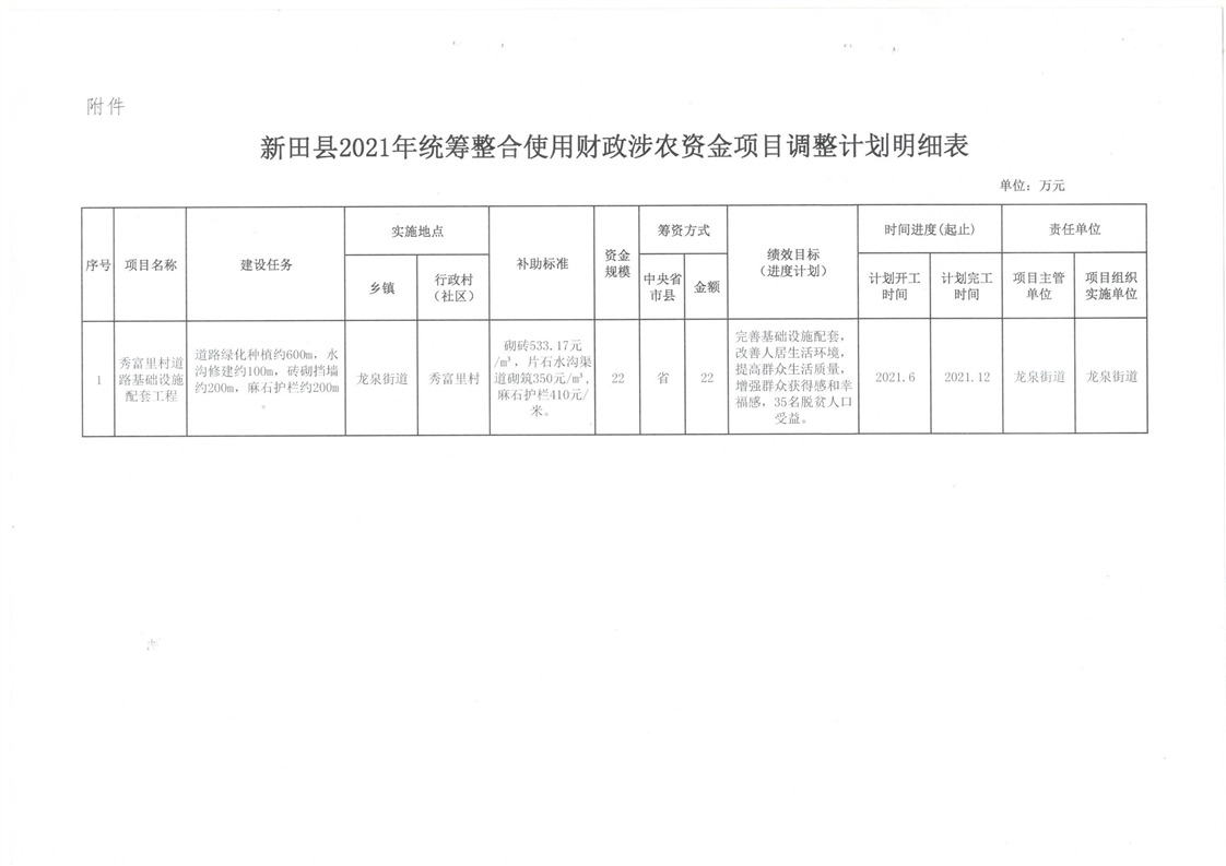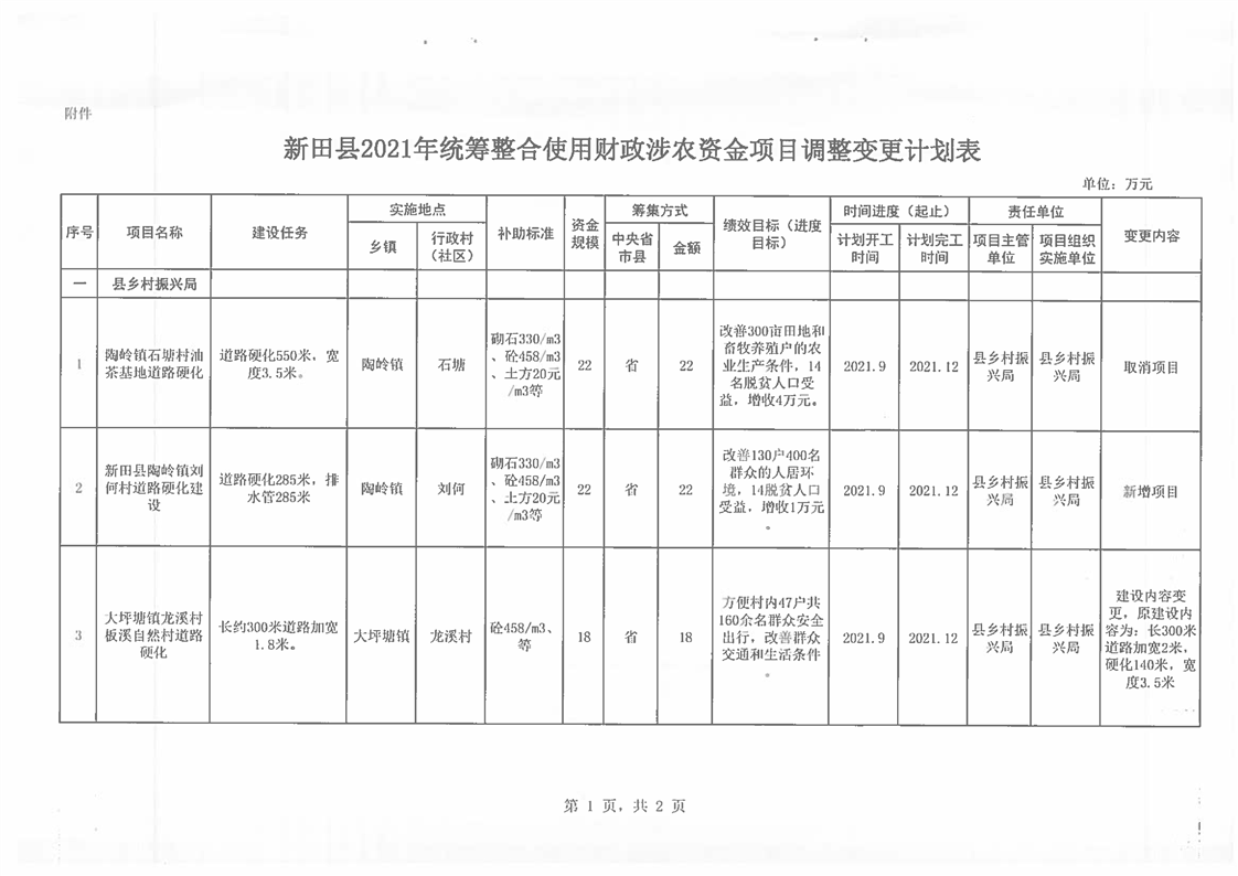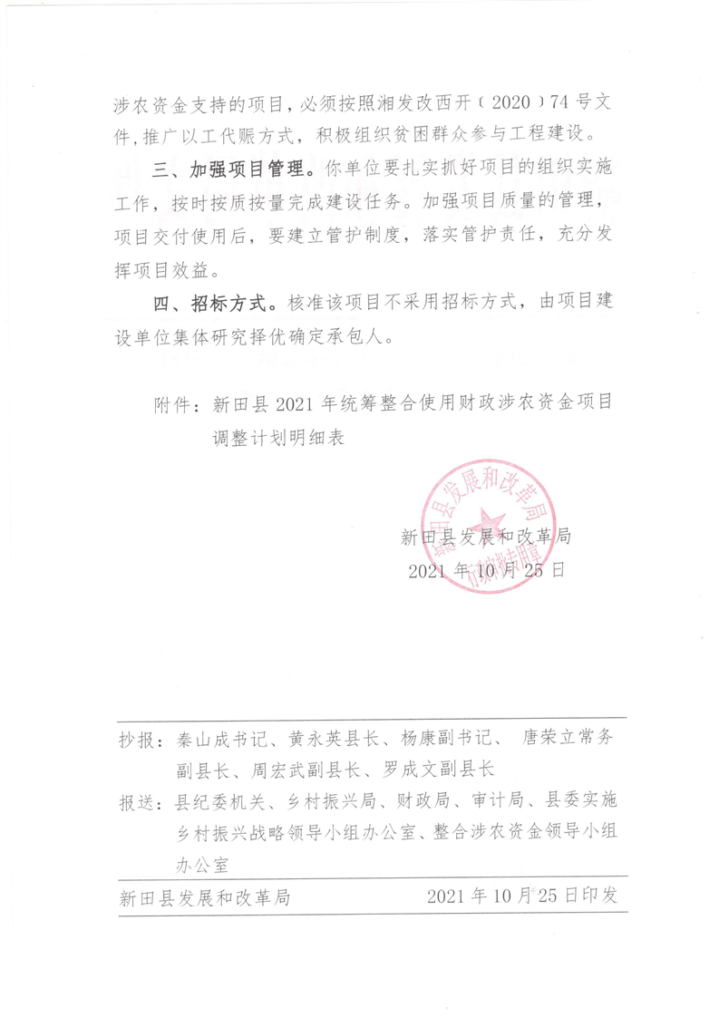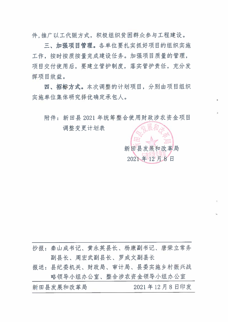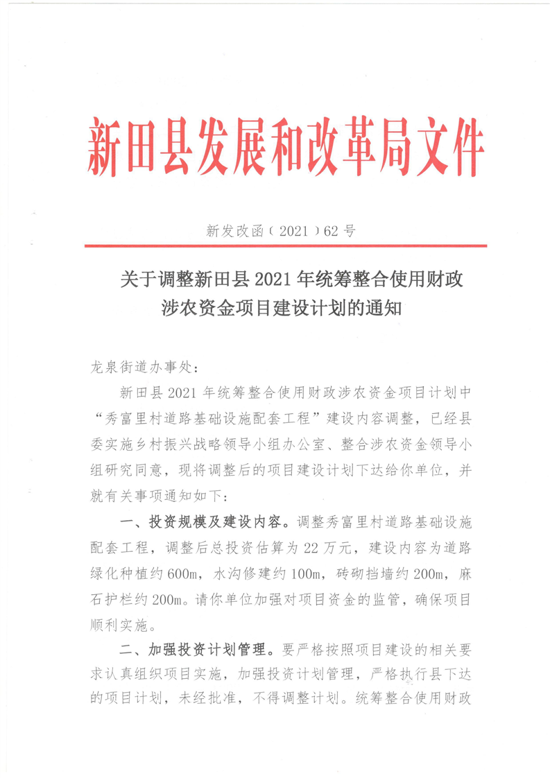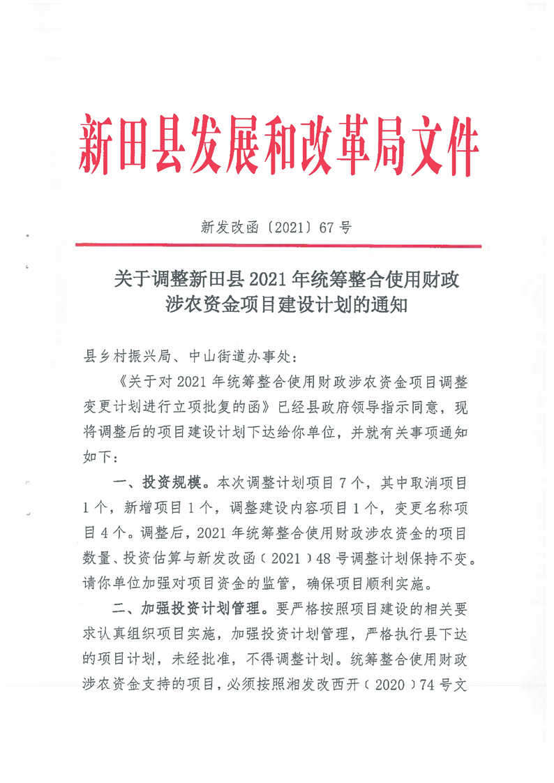关于调整新田县2021年统筹整合使用财政涉农资金项目建设计划的通知