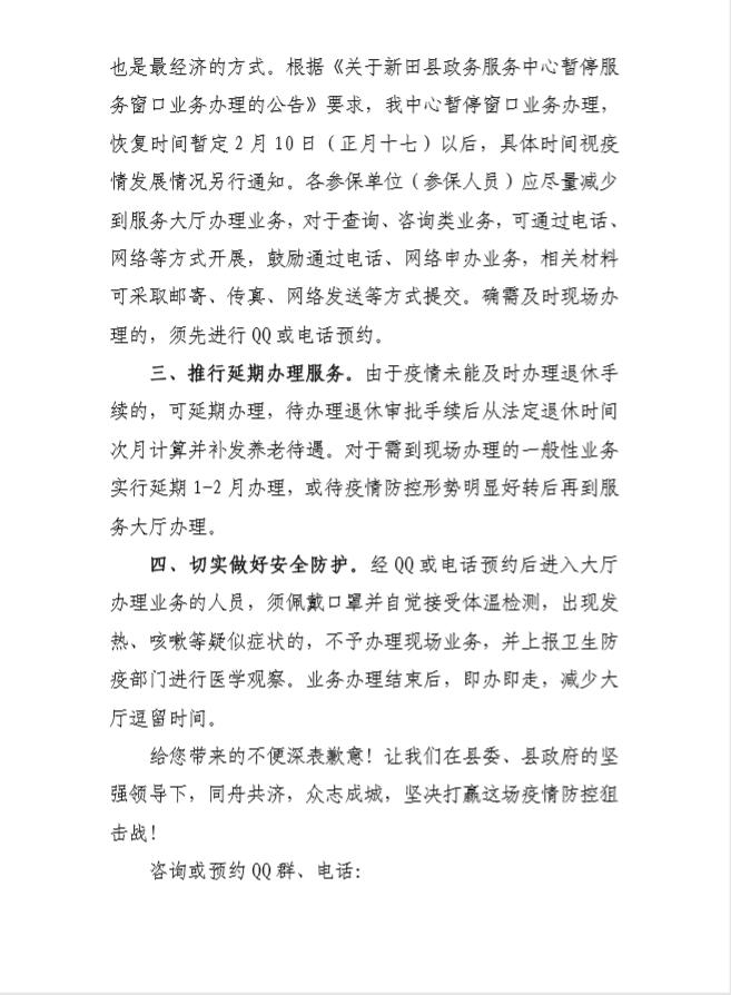 关于新型冠状病毒感染肺炎疫情防控期间全县养老保险经办服务工作的通告