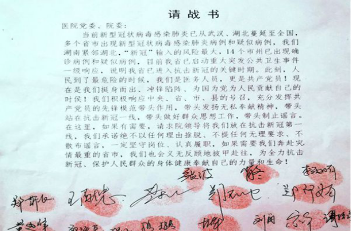 万众一心加油干,越是艰险越向前。“请求院领导将我们放在抗击新型冠状病毒感染的肺炎疫情防控一线”,1月27日,新田县人民医院56名党员医护人员集体向院党委签名请战。按下手印的那一刻,体现的是一个共产党员的初心和使命,体现的是医卫人员的责任和担当,也是大爱精神的生动诠释!