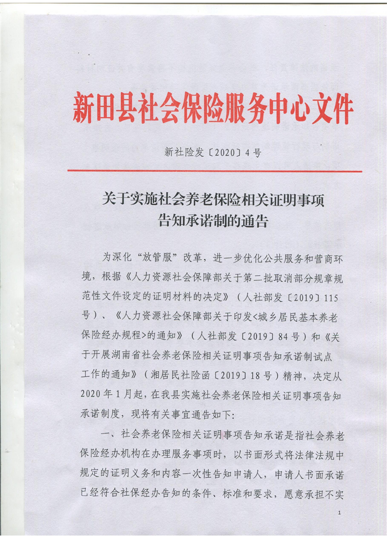 关于实施社会养老保险相关证明事项告知承诺制的通知(新社险发[2020]4号)