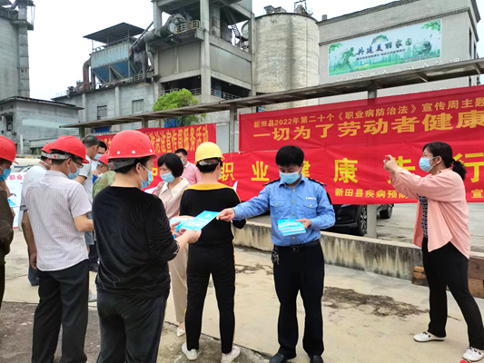 新田卫健网(通讯员 叶国富)4月27日,新田县卫生计生综合监督执法局在县卫健局的组织下,联合县总工会、疾控中心进企业开展“一切为了劳动者健康”为主题的职业病防治宣传周活动。