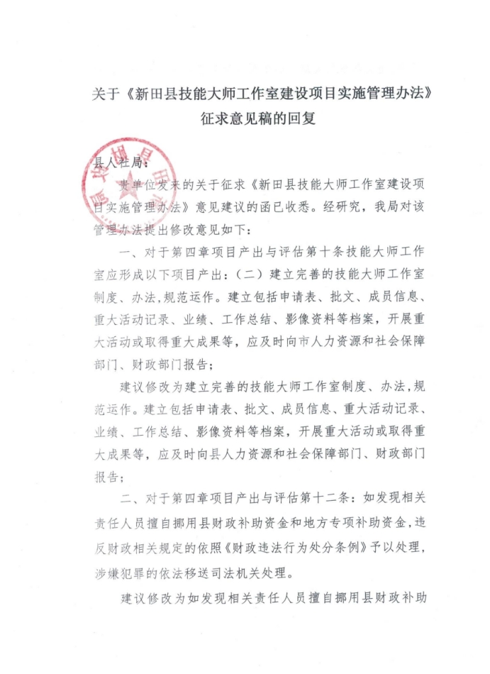 建议修改为建立完善的技能大师工作室制度、办法,规范运作。建立包括申请表、批文、成员信息、重大活动记录、业绩、工作总结、影像资料等档案,开展重大活动或取得重大成果等,应及时向县人力资源和社会保障部门、财政部门报告: