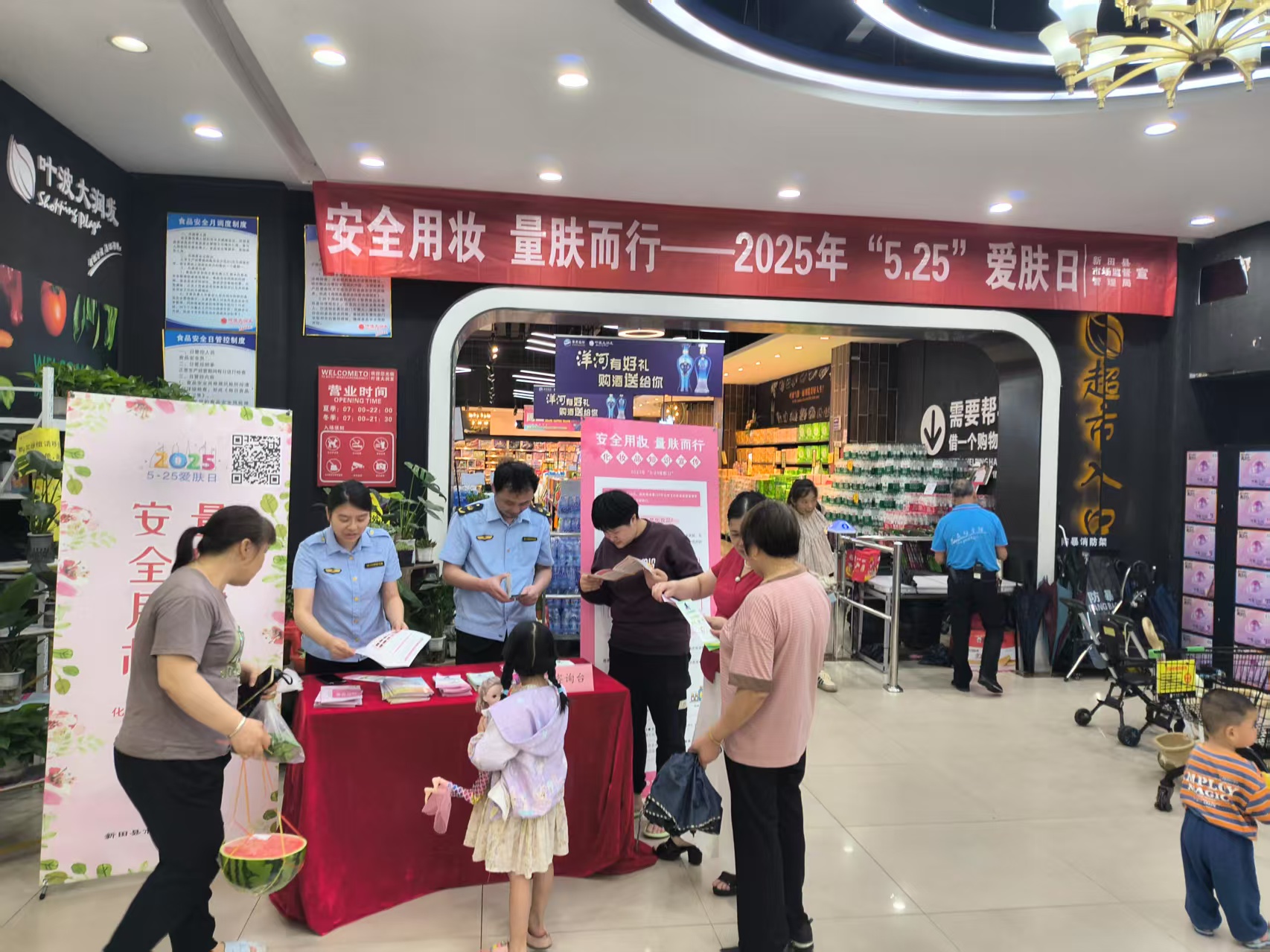 5月23日,新田县市场监督管理局在叶波大润发超市开展以“安全用妆量肤而行”为主题的5.25爱肤日宣传活动。