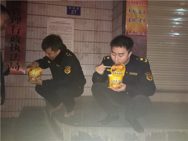 夜幕降临,“重头戏”终于要开始了。短暂与家人团聚吃完年夜饭后,快速赶赴城管局与同事交班。到局里发现部分同事正蹲在台阶上吃着不算热腾的泡面,一些同事聚成大圈讨论白天城区禁燃工作情况。向前询问,得知竟有极个别同事寸步不离禁燃岗位,已经在局吃了一天的泡面,晚上还将继续出勤,点赞之余心生敬佩。为了更好地管控城区禁燃,我们一百多名执法人员分区包片,负责各自执法巡查“领地”,我所在组主要负责巡查工业园和塘家洞,必要时配合其他组联合执法。