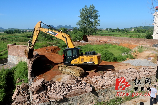 近日,新圩镇政府工作人员在国土管理动态巡查中发现,该镇山水塘村4户村民占用基本农田建房,违反国土地管理法相关规定,破坏耕地,未办理相关用地审批手续,擅自突击偷建。当天,县联合执法组动用大型挖掘机和炮机,依法对该镇山水塘村骆某、郑某、肖某和蒋某等4宗耕地建房违法建筑和基脚进行强制拆除。