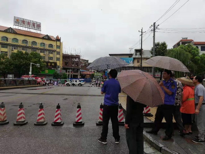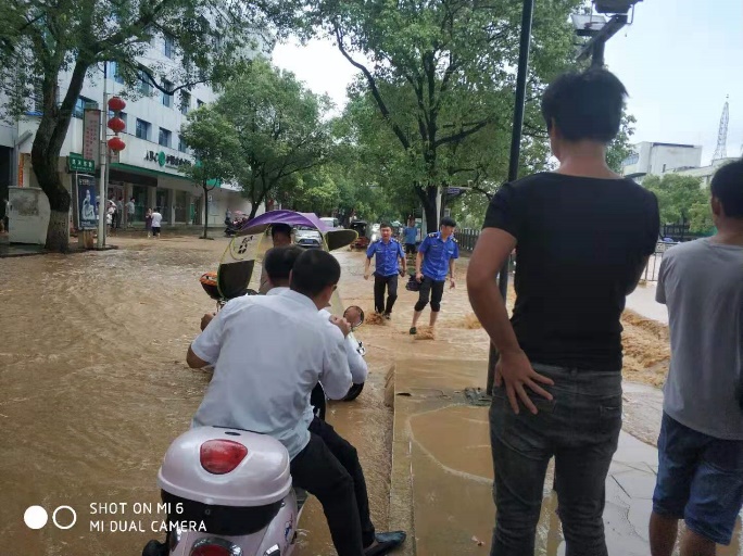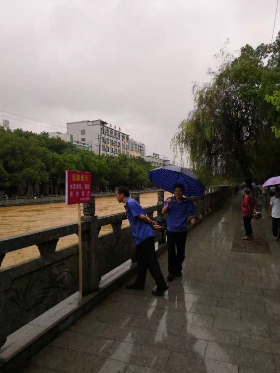 城管局党组现场调度城监大队人员设置受灾禁行区,制作10块安全指示牌放置在显眼位置,劝导过往人员车辆远离河堤,并对沿街铺面、住房中的人员进行转移劝离。一直坚守到晚上11点,洪水水位下降,警报解除。