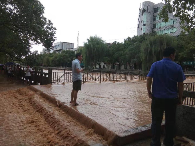 (通讯员:乐桐建 黄红兵)2019年7月13日,08时到16时我县普降大到暴雨,局地大暴雨,累计雨量≥100mm,导致日西河的水位暴涨。在城管局城东组队员滨河路巡查时,最先发现中间桥路段,洪水已经淹没桥体,涌上路面,不断向农业银行营业厅及附近的家属楼冲去,对家属楼居民和过往行人的生命安全造成威胁。险情就是命令,城管局迅速启动防汛抗洪紧急预案,全体干部职工取消双休休假,上路做好防汛保安工作。