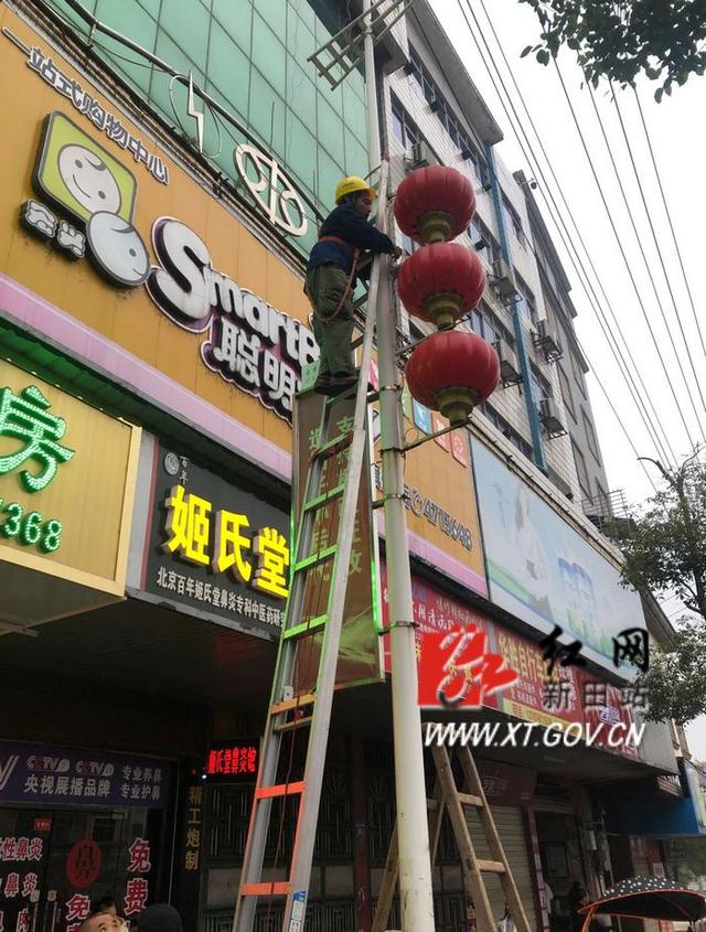 新田县城管局正组织路灯管理所工作人员有序安装LED红灯笼和中国结
